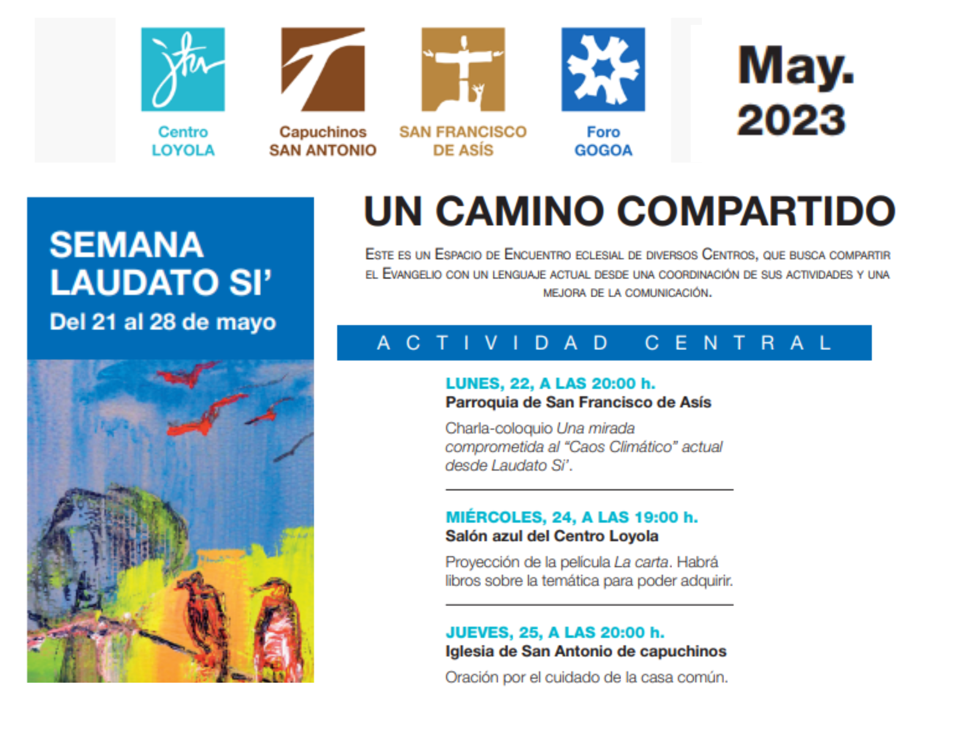 Lunes, 22, a las 20:00, en la parroquia de San Francisco de Asís, charla-coloquio Una mirada comprometida al “Caos Climático” actual desde Laudato Si.